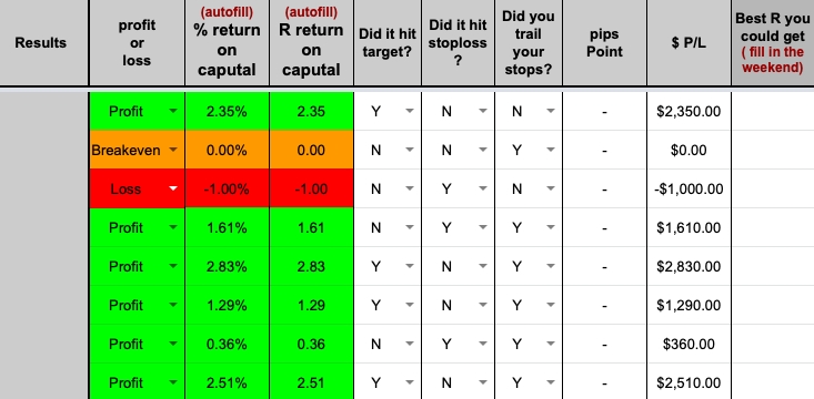 Best R you could have get: This is something that you need to fill at the end of the week. when you are reviewing your trades can you see that you could have a better performance?