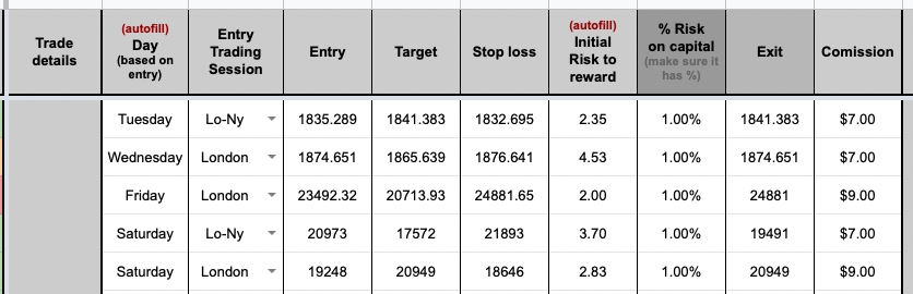 Return on capital (%): (autofill) This number is the return on your capital based on %. For example if you had a trade for 2.5R and you have risked 1% of your capital, the return would be 2.5%. if the risk you've took is something else then the number might be differenet.