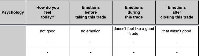 Emotions before taking this trade: Do you feel like this will be a good trade? are you scared to take this trade? do you feel stressed? you feel nothing?
