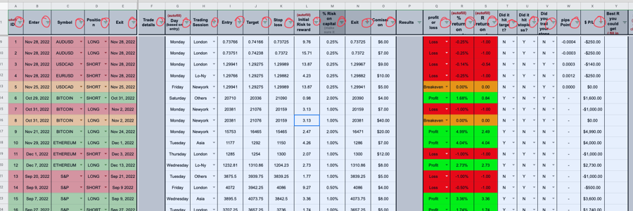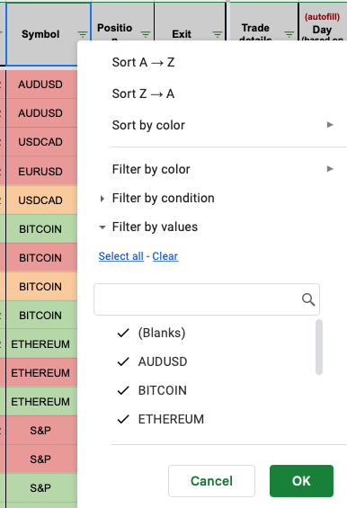You can use this trick to filter based on whatever you like. for example you can click on the "position" column and filter based on only Long trade or Short trades. you can select the "Did you trail your stoploss" column and only see the trades that have the "Y" or "N" value.