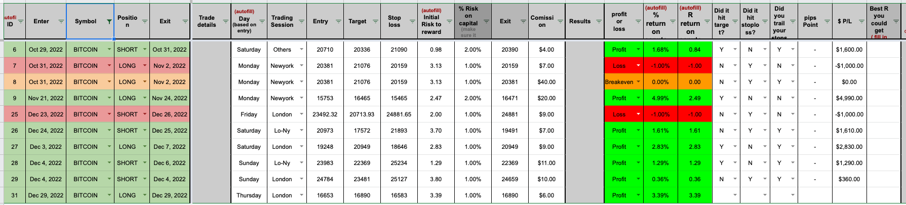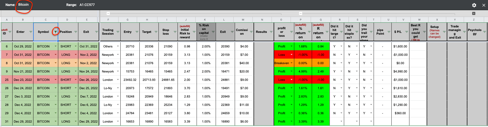 Now here you see that we have filtered the whole sheet based on the BITCOIN trades. beautiful.